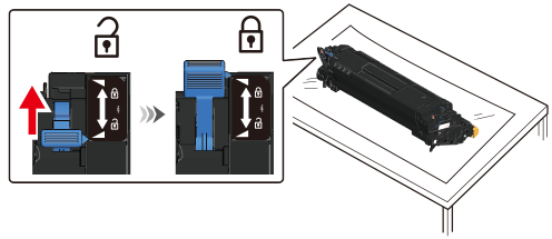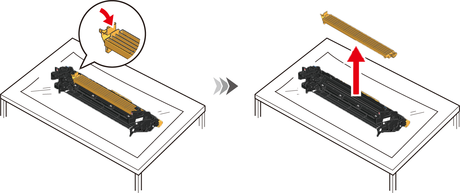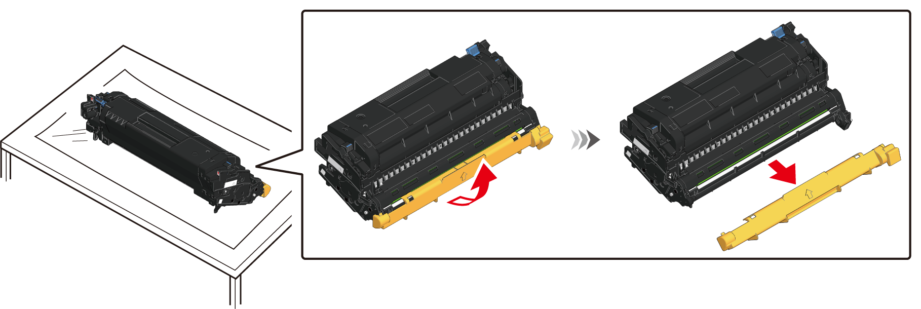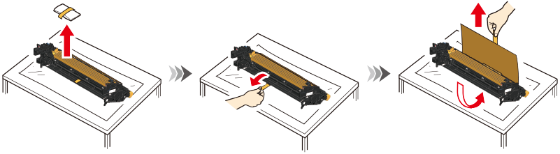 Remove the new image drum from its packaging bag, and then place it on a flat surface covered with newspaper or the like.
