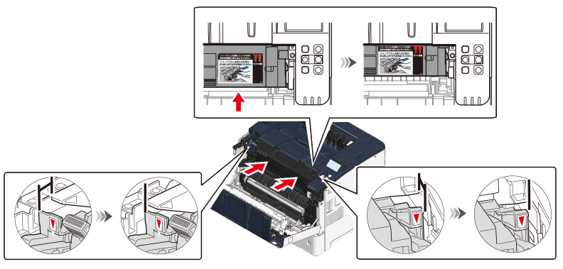 Check the [Installation position] by the right label on the toner cartridge, and press in the toner cartridge. Check that the triangular marks on the left and right sides of the image drum are all the way in.
