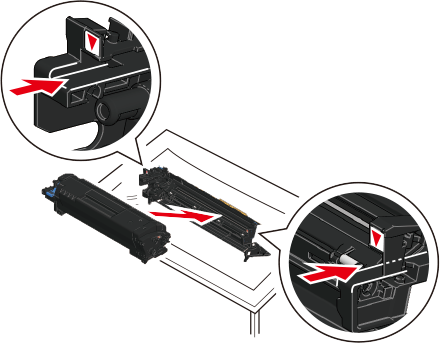 Place your fingers on the left and right protrusions (blue seals) of the image drum and press them firmly into the toner cartridge.
