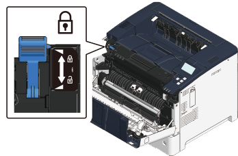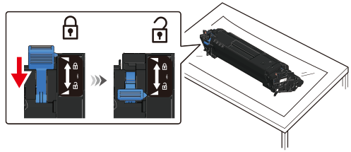 Rotate the blue lever on the left side of the toner cartridge in the direction of the lock mark until it stops.