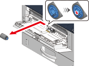 Press down on the center of the MP tray, and then press and hold the white part which is visible through the small window at the bottom of the separation roller. Remove the lower paper feed roller (without gear) by expanding the side protrusion outward and sliding it to the left.