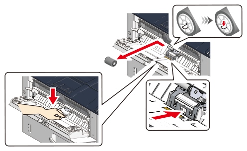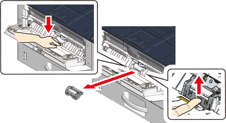 Press down on the center of the MP tray, place your finger over the small window on the lower side of the separation roller and push it up to remove the separation roller.