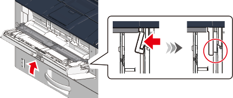 Lift the MP tray gently, press the right arm of the MP tray inwards, and hook the protrusion of the arm into the groove.