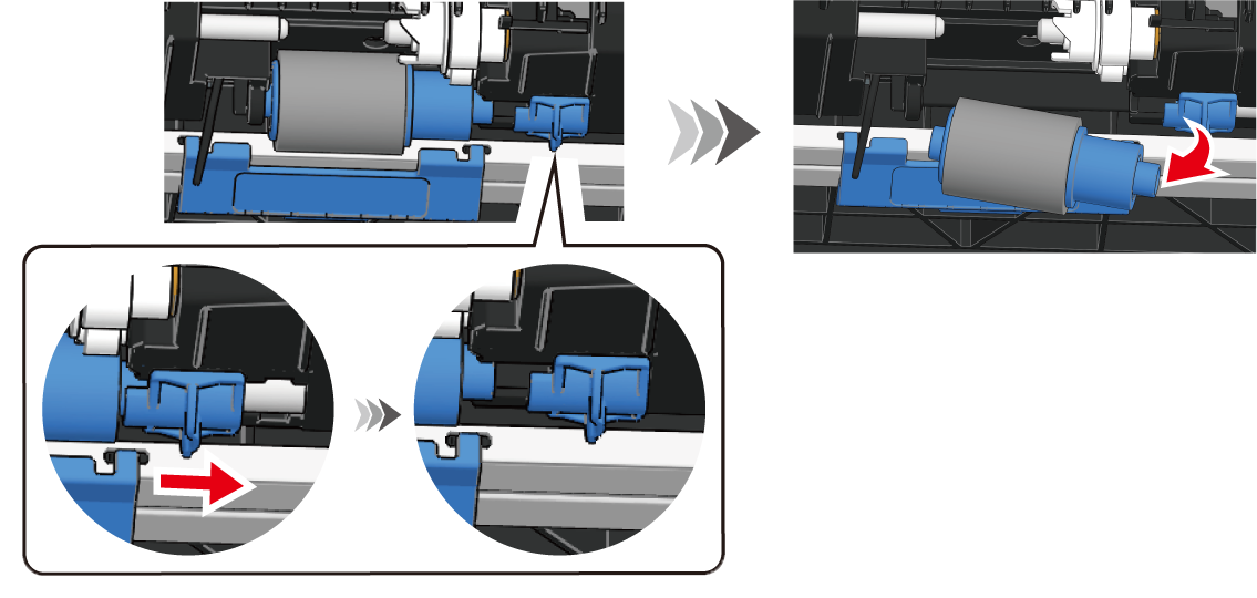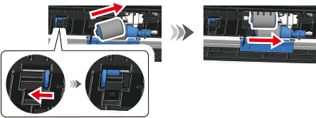 While pushing the blue lever on the left side of the front paper feed roller (without gear) to the left, slide the paper feed roller (without gear) to the left to remove it.