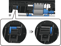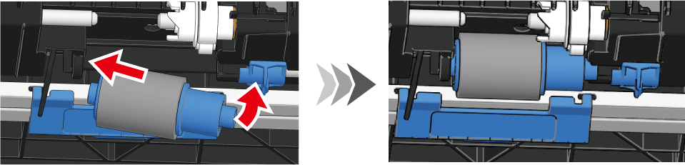 Mount the new paper feed roller (without gear). While pushing the left blue lever to the left, press to mount the paper feed roller (without gears) onto the white shaft.