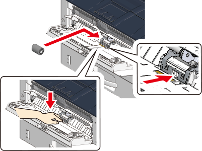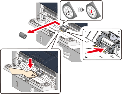 Press down on the center of the MP tray, place your finger over the small window on the lower side of the separation roller and push it up to remove the separation roller.
