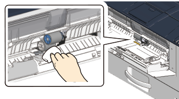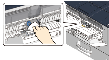 Wipe the paper feed roller with a cloth slightly moistened with water while rotating the blue gear downward.