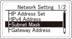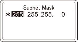 Set the subnet mask in the same way as the IP address. After all the digits have been set, the cursor will return to the first digit. Check that [*] is displayed to the left of the set value, and then press «BACK».