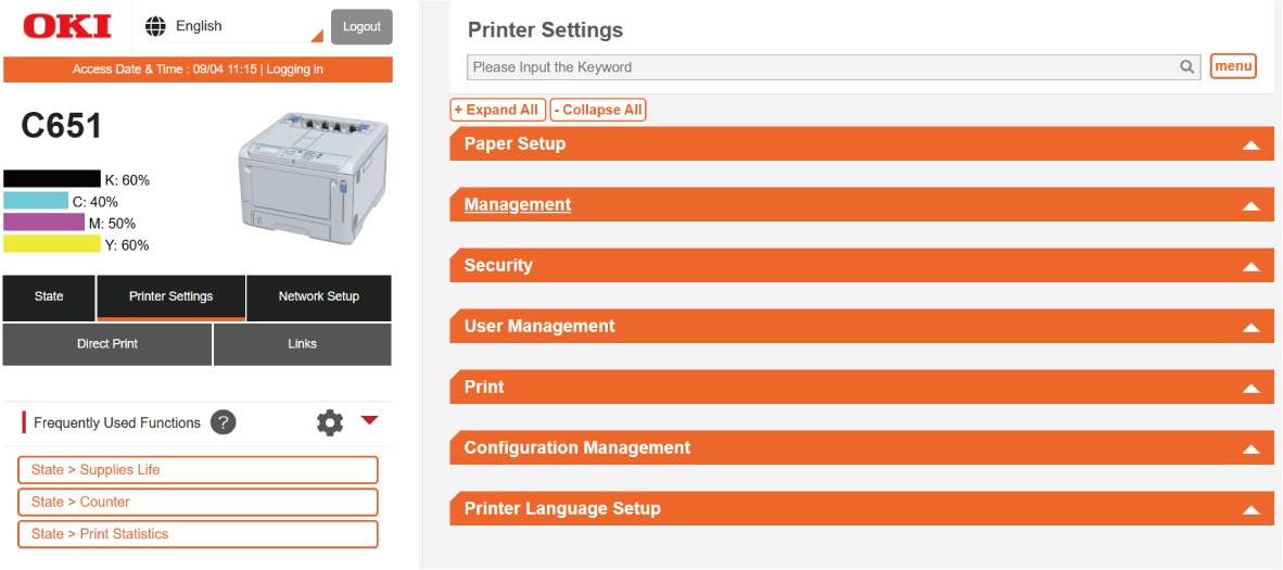 | Printer management | Cloud Setting | You can set the information related to cloud connection. | ◯ | ||