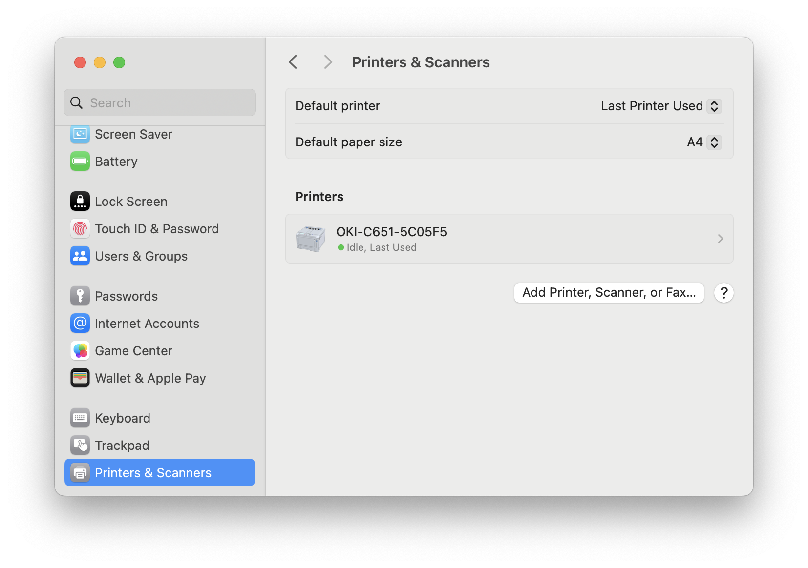 Once the machine is added to the [Printers] list, select the machine to display the menu. Make sure that "OKI C651 PS" is displayed in [Kind].