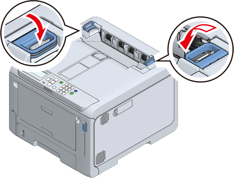 Drücken Sie den linken und rechten Griff der Fixiereinheit nach unten bis sie einrasten.