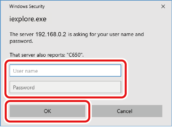 Geben Sie „admin“ in [User name (Benutzername)] und das aktuelle Kennwort in [Password (Kennwort)] ein. Klicken Sie anschließend auf [OK].