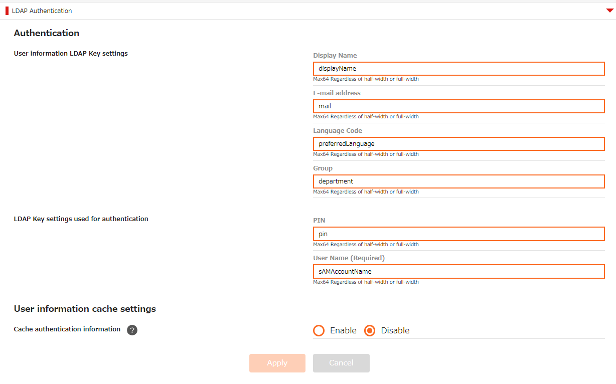 Inserire la chiave LDAP.da cui è ottenuto ogni valore.- Visualizza nome: Impostare la chiave LDAP per ottenere il nome display o informazioni utente.