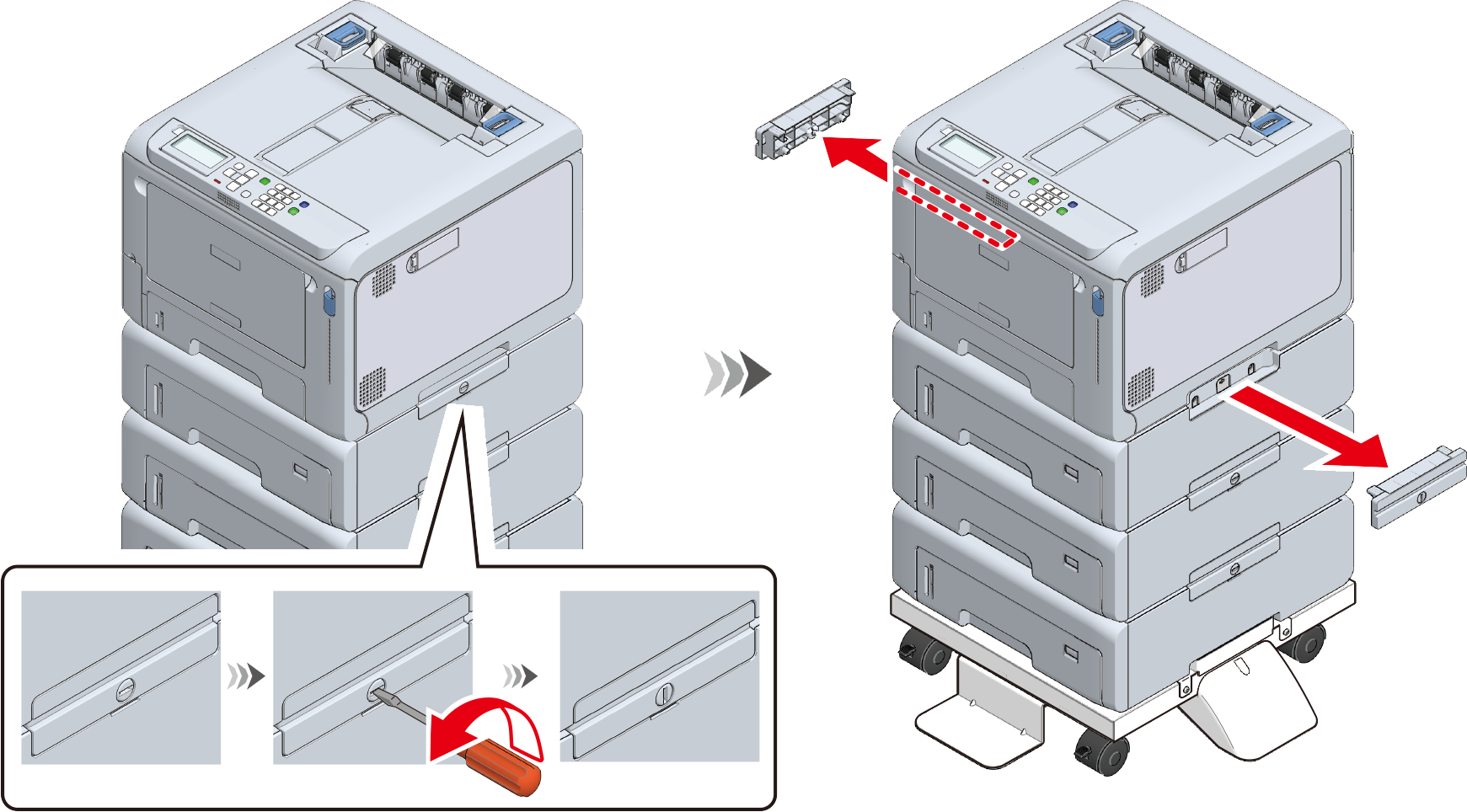 Als de optionele uitbreidingslade-eenheid is geïnstalleerd, gebruik dan een platte schroevendraaier om de onderdelen (x 2) die dit apparaat en de uitbreidingslade-eenheid bevestigen te verwijderen.