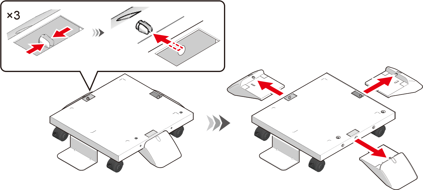 Plaats de zwenkwielbasis in de verpakkingsdoos. Plaats de metalen bevestigingen (x 2) van de zwenkwielbasis, de bevestigingspinnen (x 2), antikantelvoet b (x 3) en antikantelvoet a die in stappen 13 tot 16 werden verwijderd eveneens in de verpakkingsdoos.