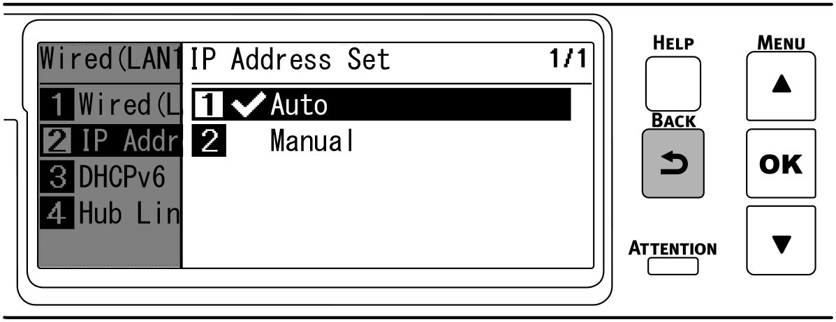 Druk op «BACK (TERUG)», druk vervolgens op ▼ om [IPv4 Address (IPv4-adres)] op het scherm [Wired(LAN1) Setup (Bedrade (LAN1) -instelling] te selecteren en druk tot slot op «OK».