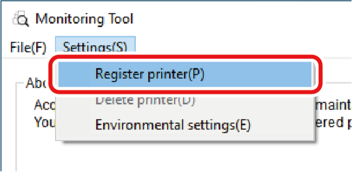 - Selecteer [Register printer (Printer registreren)] in het menu [Settings (Instellingen)].