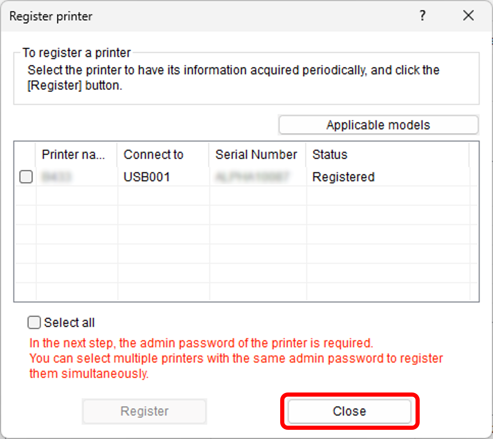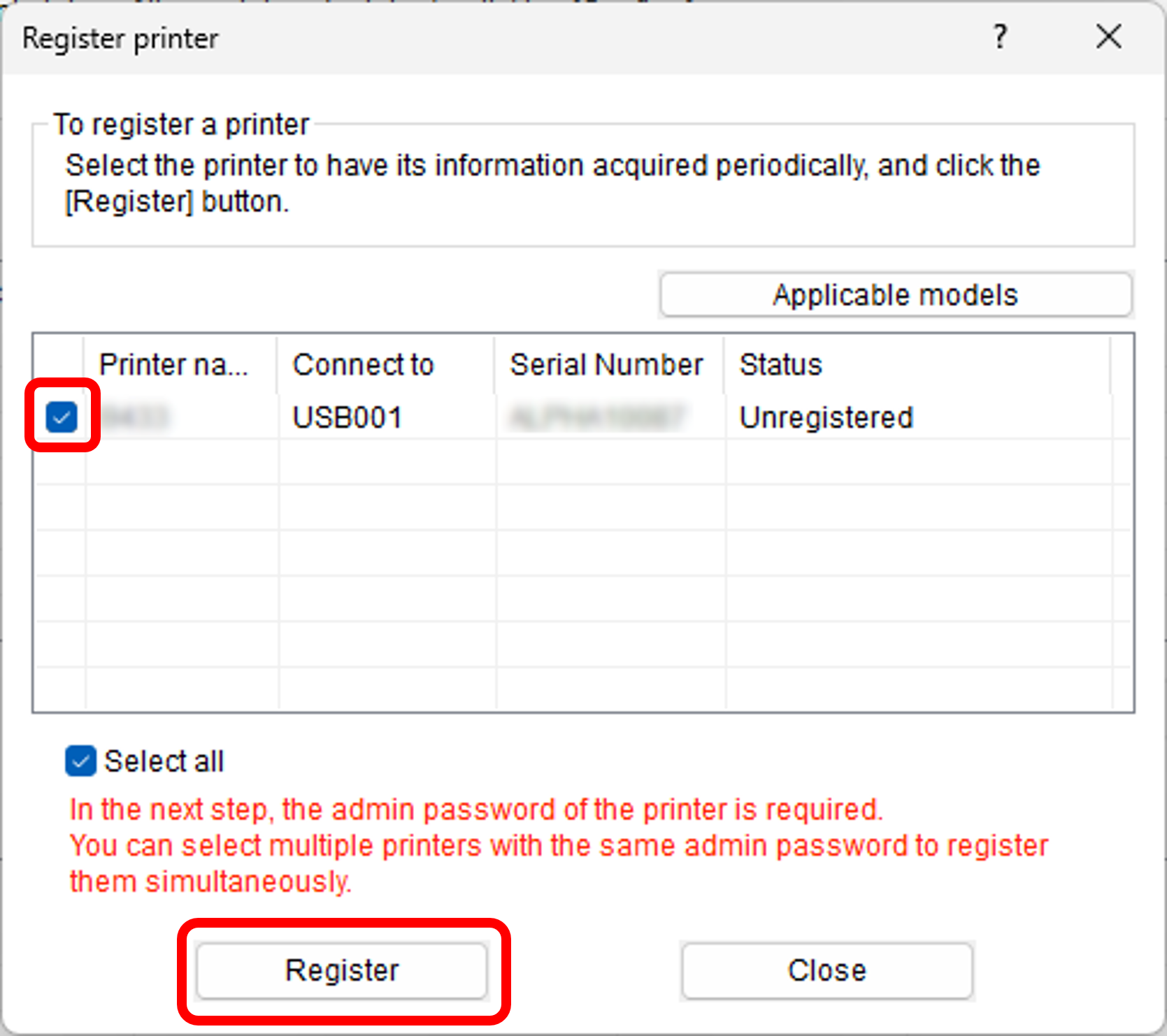 - Selecteer de te registreren printer in de printerlijst en klik op [Register (Registreren)].