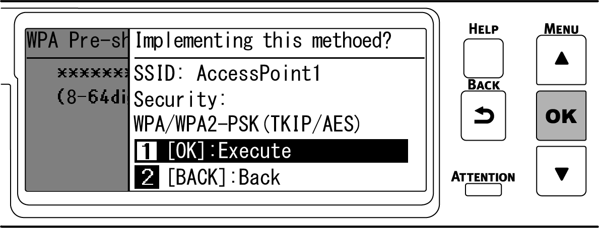 "Implementing this method? (Deze methode implementeren?)" wordt weergegeven en de SSID die u in stap 7 van het bevestigingsscherm hebt geselecteerd en de encryptiemethode die u in stap 8 hebt ingevoerd, worden als beveiligingsmethode weergegeven. Als de SSID identiek is aan de SSID die u in stap 1 hebt genoteerd, druk dan op «OK».
