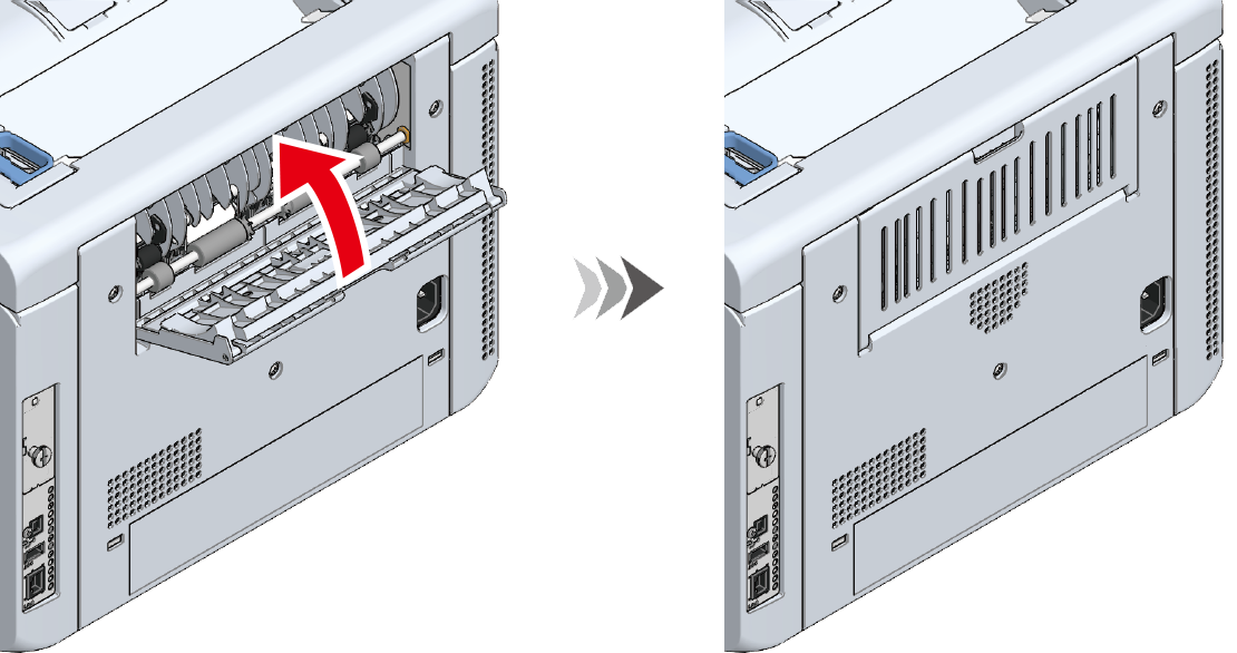 - Compruebe que la bandeja de salida trasera de la parte trasera de la máquina, esté cerrada. Cuando esté abierta la bandeja de salida trasera, el papel sale siempre por la bandeja de salida trasera.
