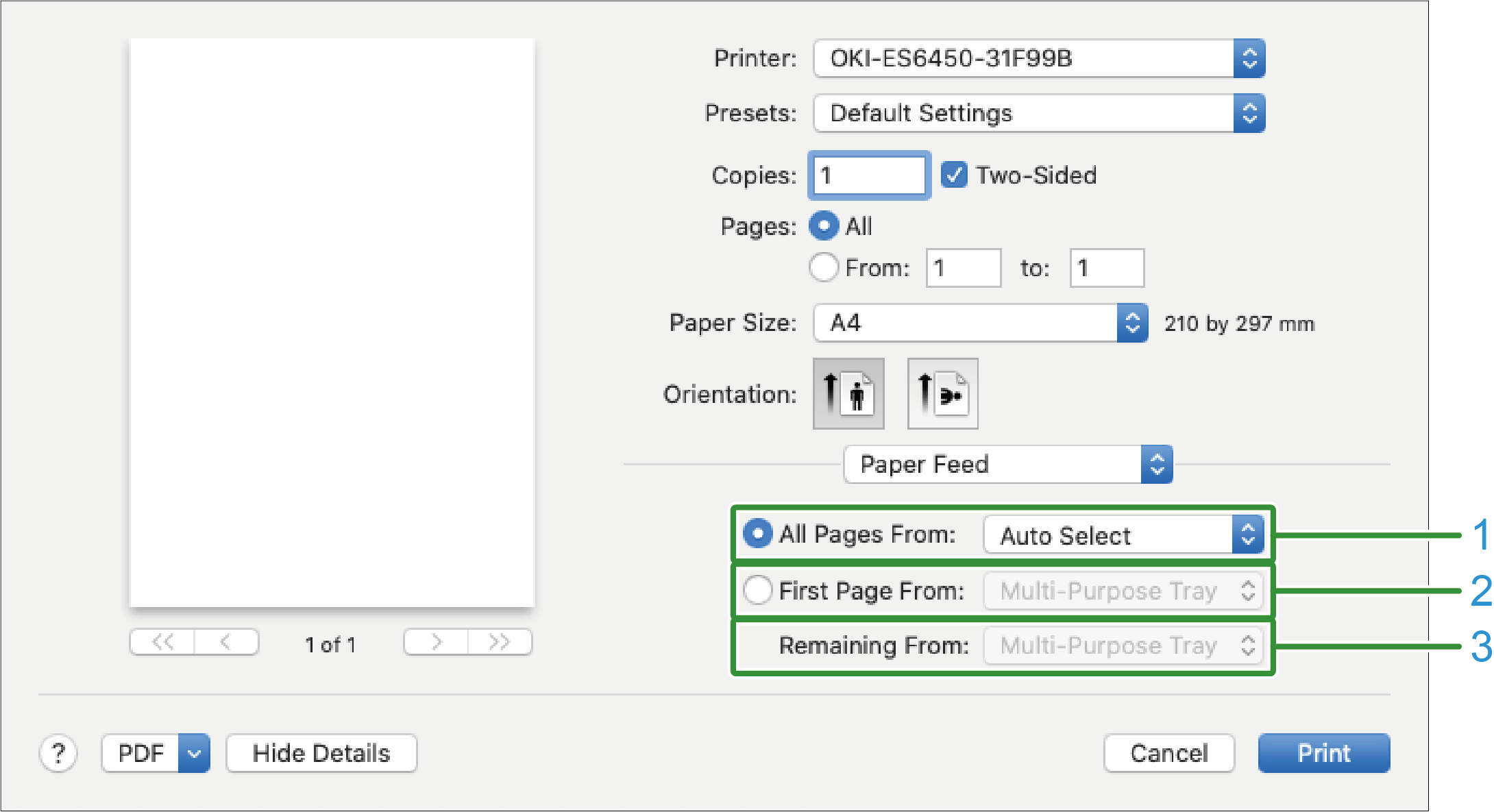 2 | First Page From (La primera página desde) | Seleccione este ajuste para imprimir solamente la primera página de la bandeja especificada. |