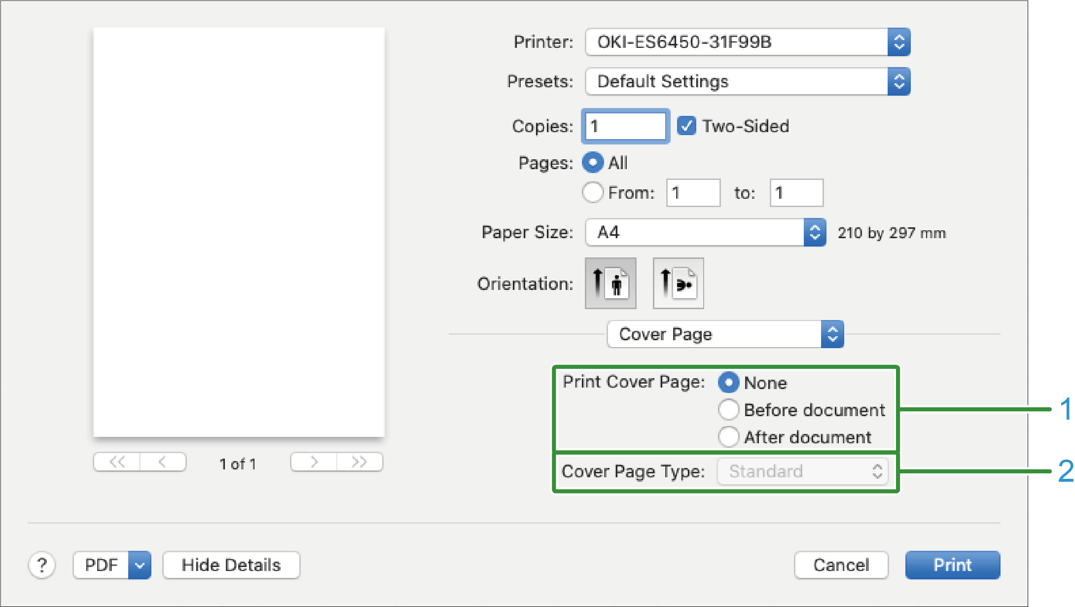 1 | Print Cover Page (Imprimir portada) | Especifica la impresión de la portada. |