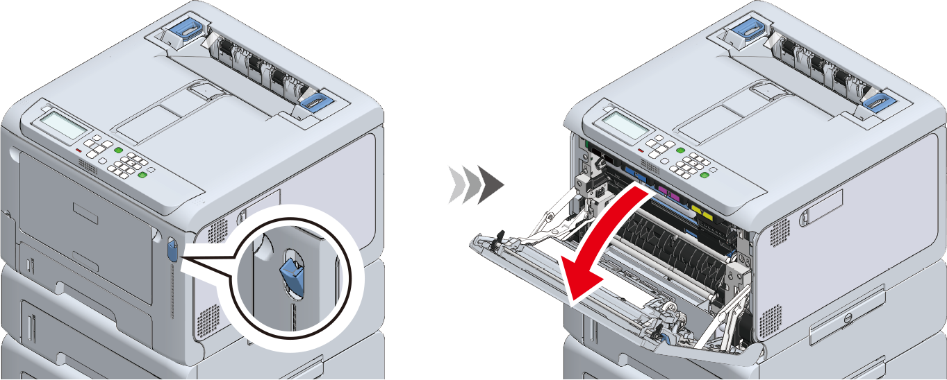 Tire de la palanca de la tapa frontal abierta (azul) para abrir la cubierta delantera.