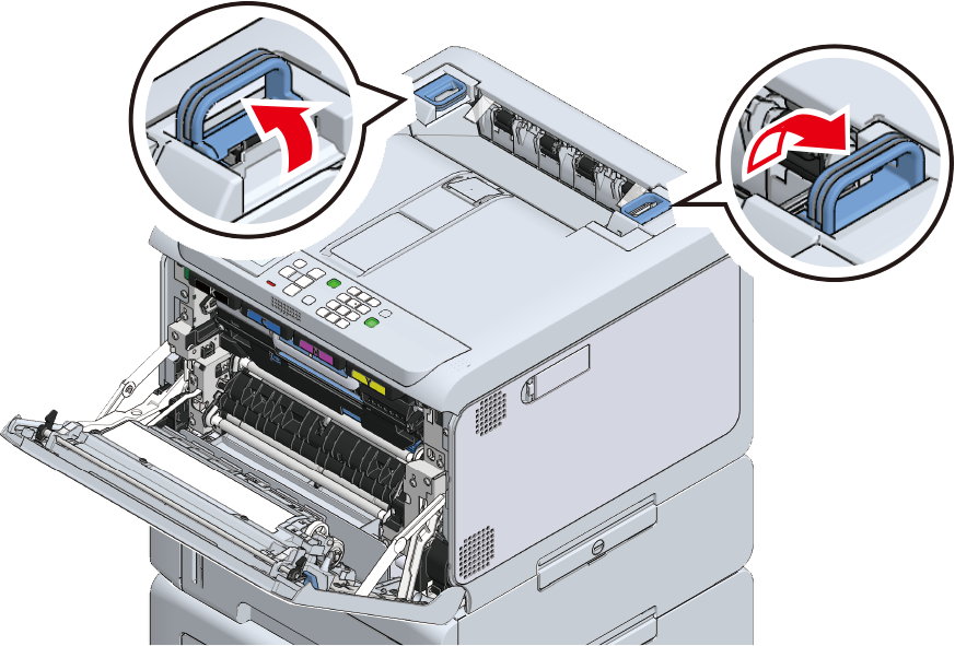 Levante las asas izquierda y derecha de la unidad del fusor en la parte posterior de la bandeja de salida hasta que oiga clic y luego suelte la cerradura.