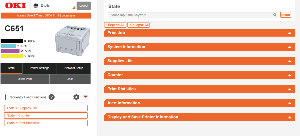 Puede comprobar la vida útil de los suministros, las estadísticas de impresión y la información del sistema y de la red de esta máquina.