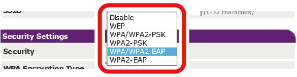 Selecione [WPA/WPA2-EAP (WPA/WPA2-EAP)] em [Security (Segurança)] das [Security Settings (Configurações de segurança)].