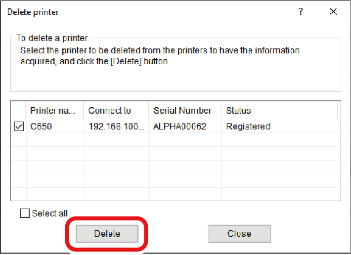 Markér printeren, der skal slettes, og klik på [Delete (Slet)].