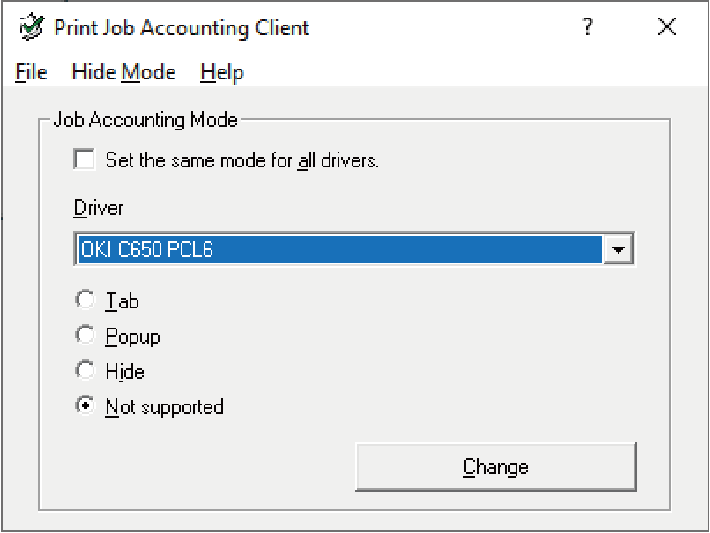 - Klik på [Start (Start)], og vælg [Okidata] eller [OKI] - [Change Job Accounting Mode (Skift opgavekontotilstand)].