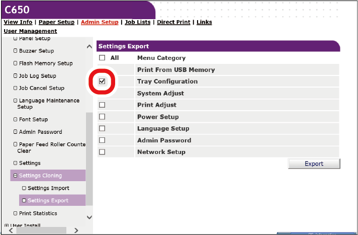 Klik på [Settings Export (Eksporter indstillinger)].