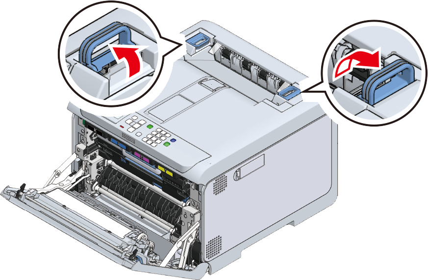 Løft udløserhåndtaget til frontdækslet (blå) for at åbne frontdækslet.