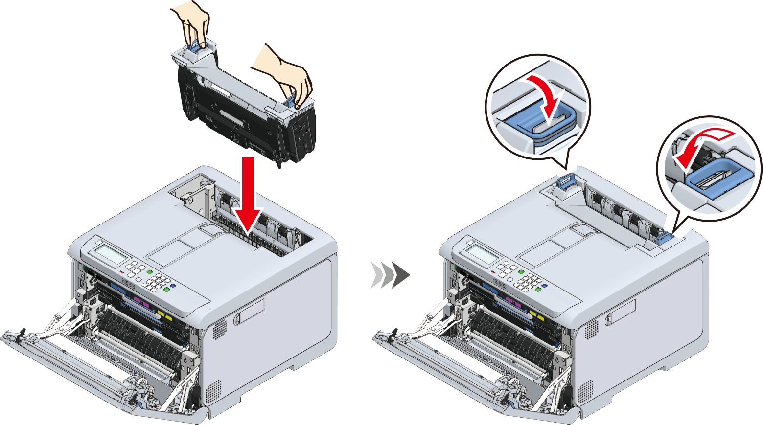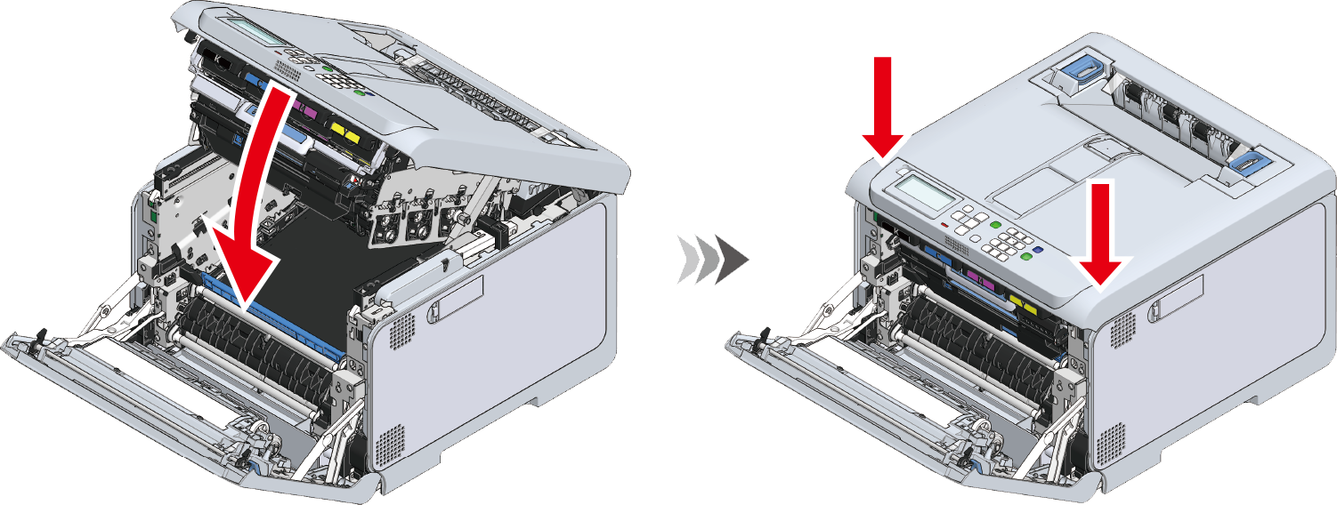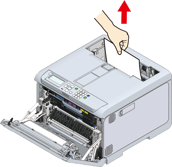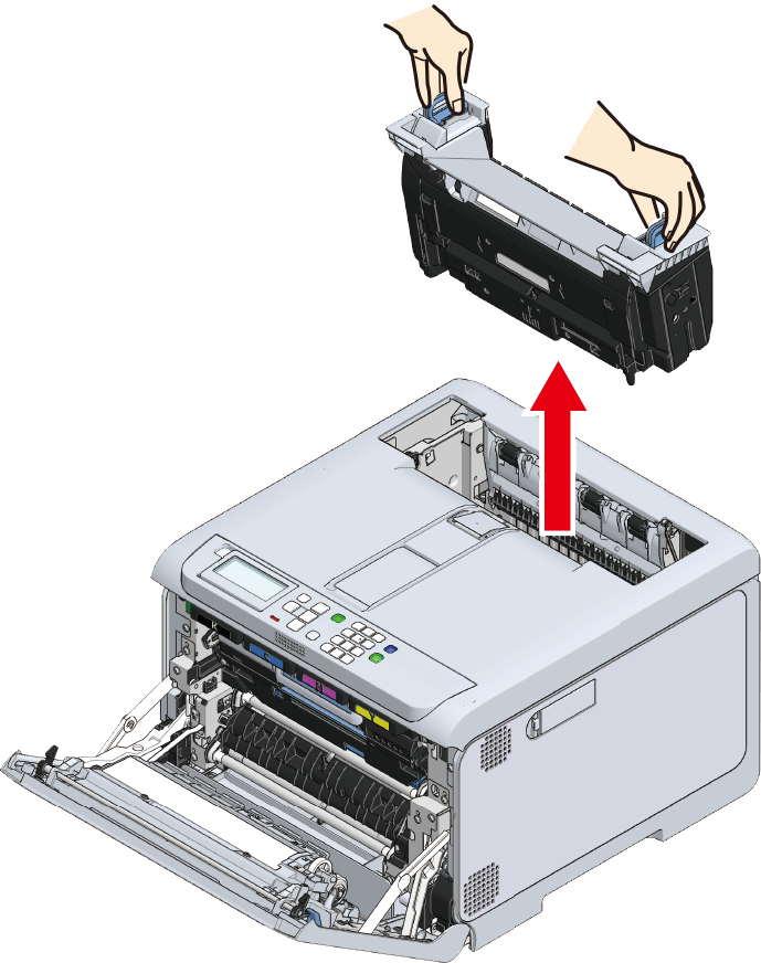 - Sørg for, at fikseringsenheden ikke ligger løst fra toppen af udskriftsbakken. Såfremt den ligger løst, kan fikseringsenheden ikke identificeres, hvorved det er umuligt at starte udskrivning.