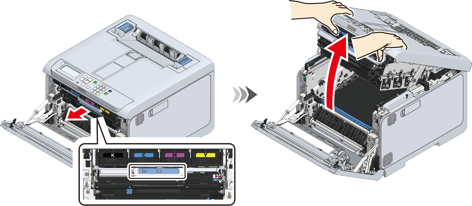Træk i L2-håndtaget, og løft udskriftsbakken til stoppositionen.