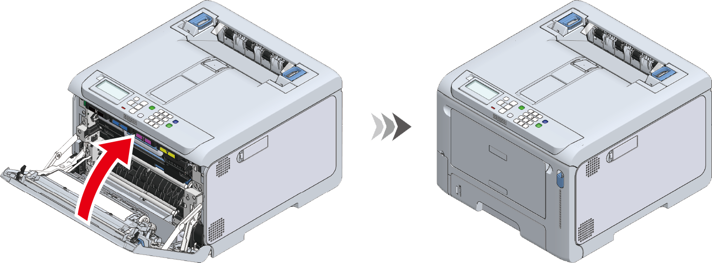 - Frontdækslet kan ikke lukkes, medmindre alle billedtromler i de fire farver er installeret.