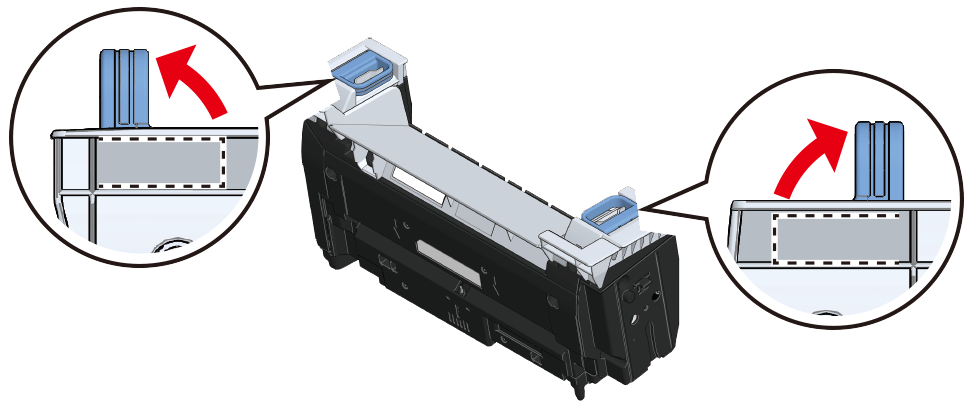 Tag den nye fikseringsenhed ud af kassen, og løft de venstre og højre håndtag lodret op, indtil der høres et klik.