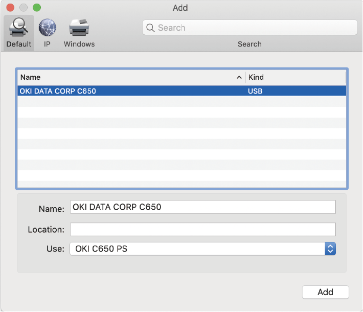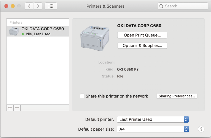 Sørg for, at denne maskine er føjet til listen over [Printers (Printere)], og at "OKI C650 PS" vises i [Type (Type)].