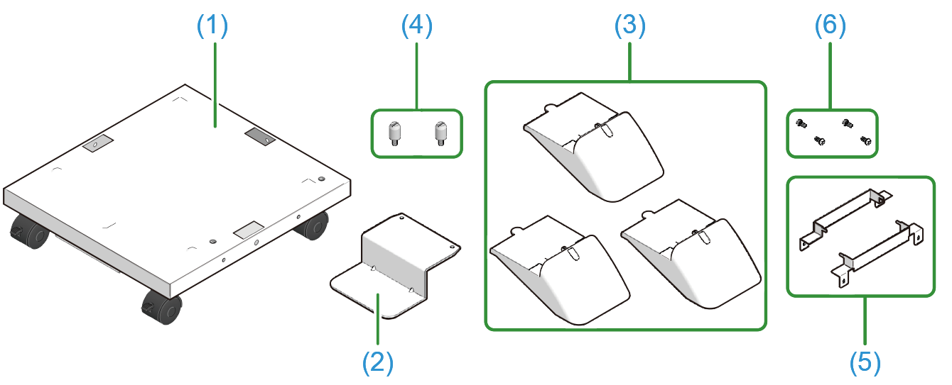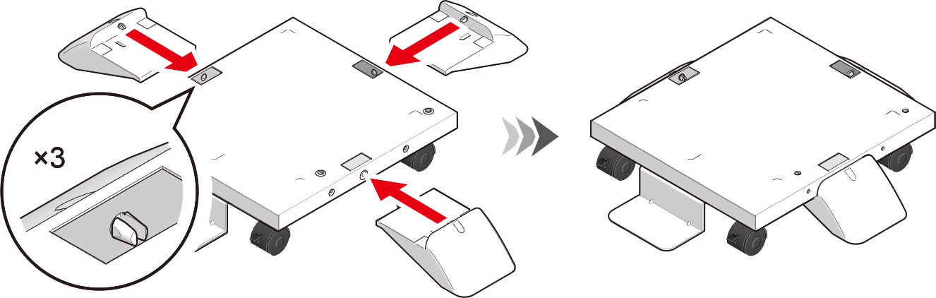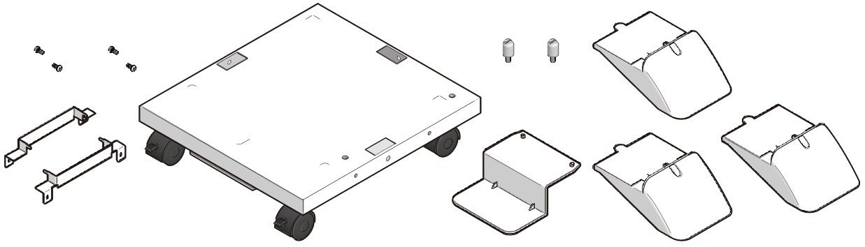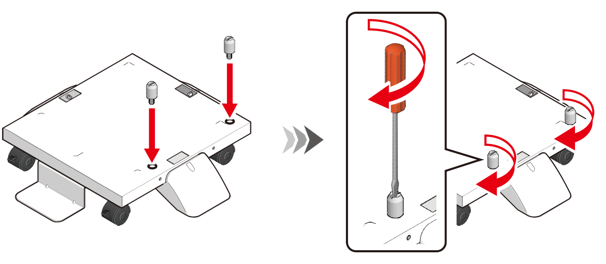 - Fastgør hovedenheden eller den ekstra bakke og det dedikerede hjulstativ ved brug af metalarmaturerne (x 2) og skruerne (x 4) med en Phillips-skruetrækker.