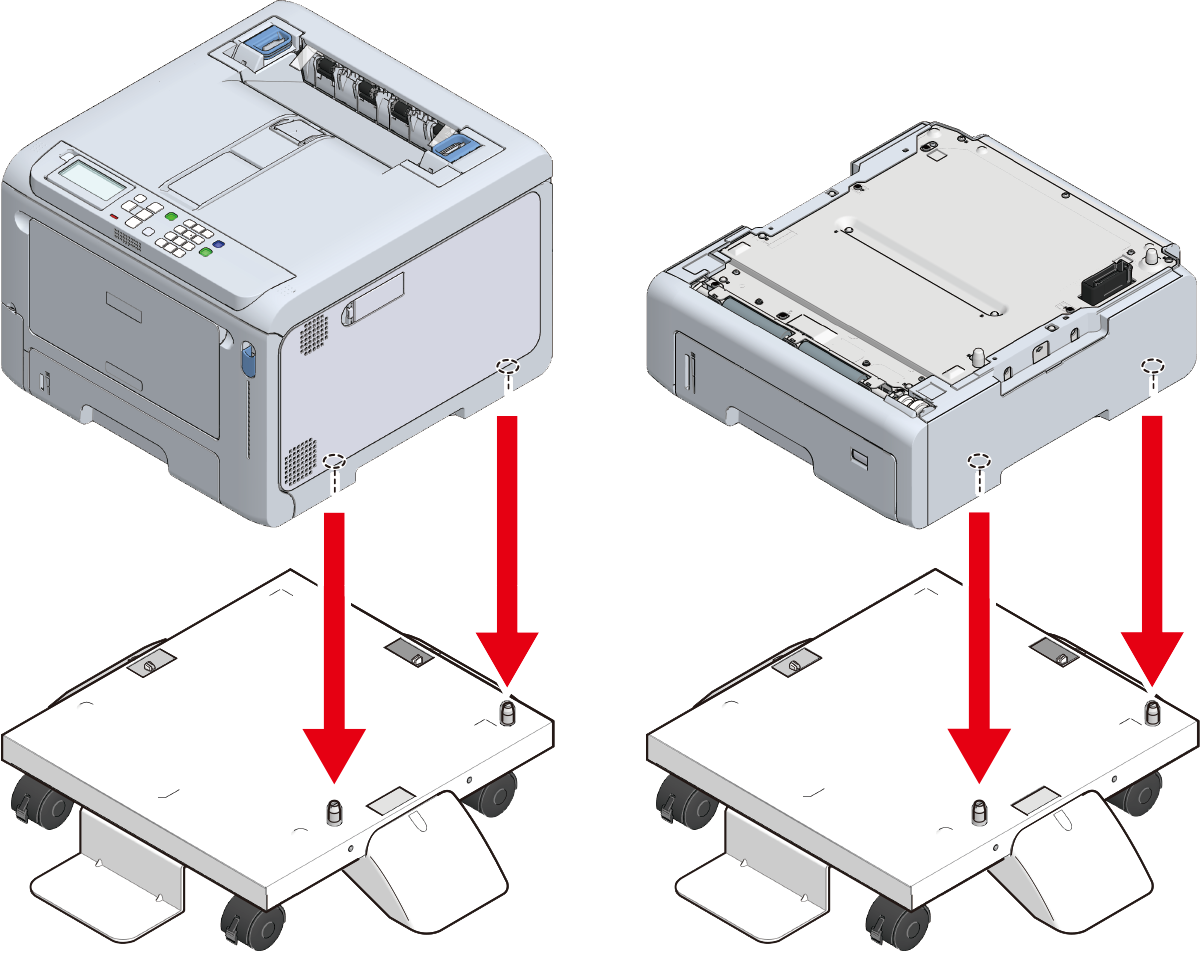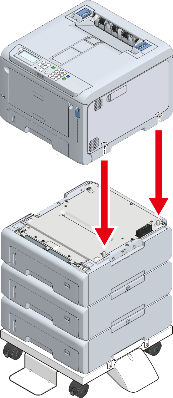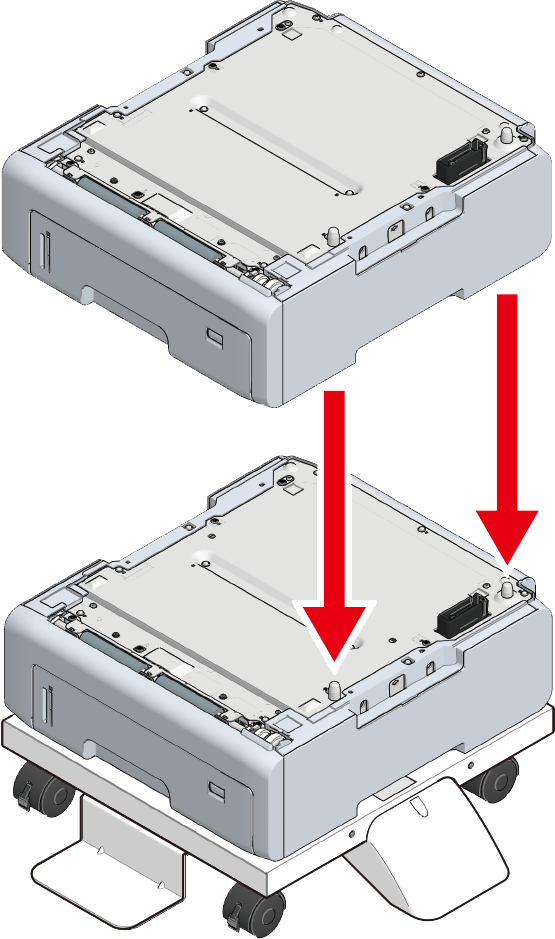 Når hovedenheden eller den ekstra bakke flugter med det dedikerede hjulstativ på højre side og fortil, skal du forsigtigt stable dem, så positioneringsstifterne i det dedikerede hjulstativ passer ind i hullerne i bunden.