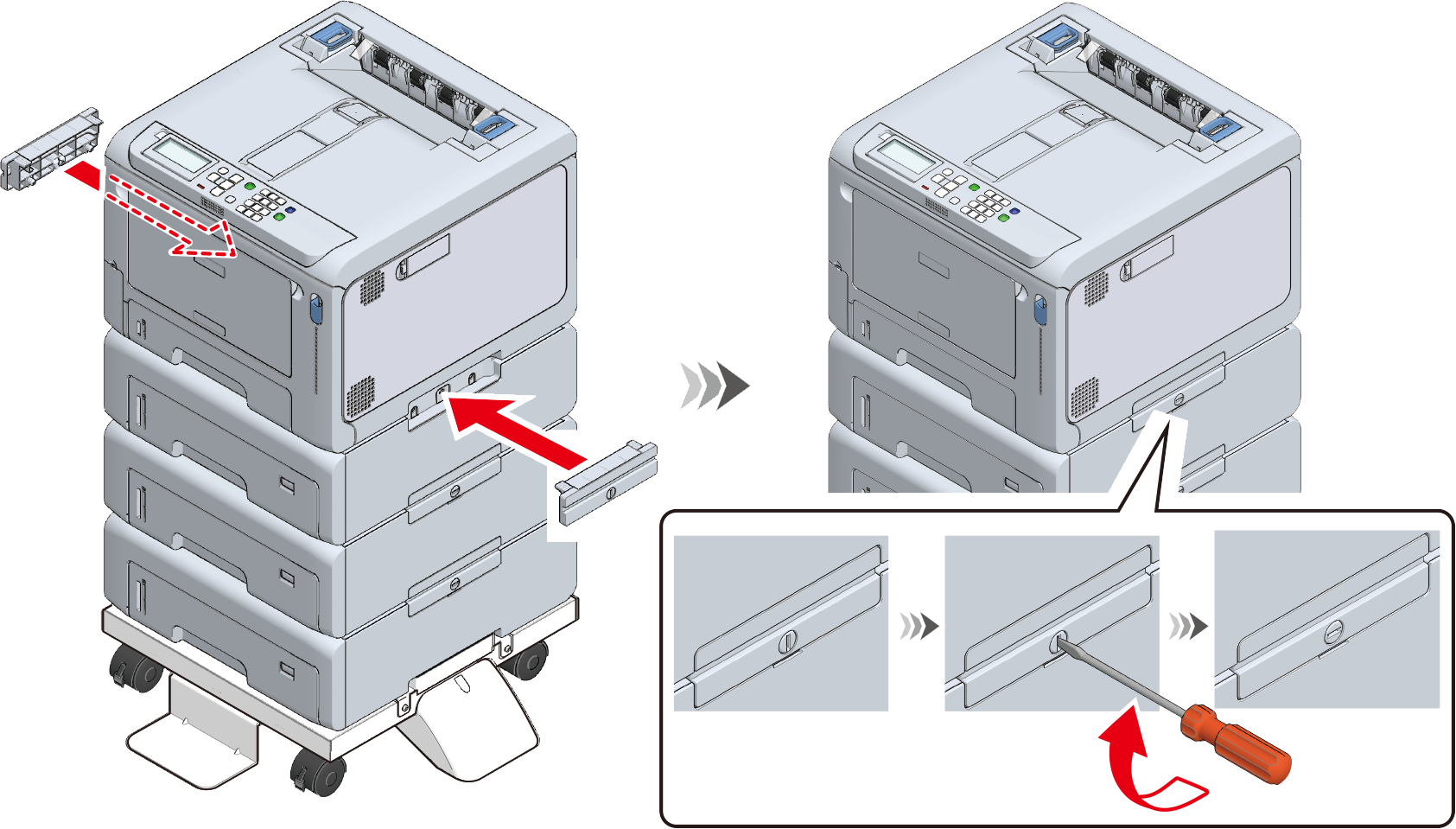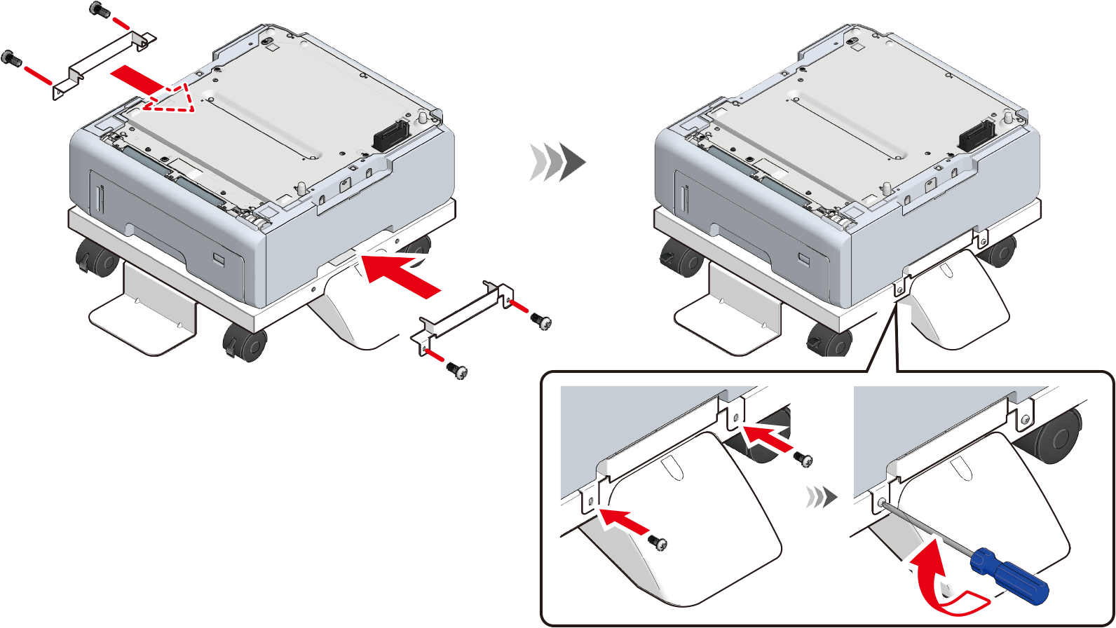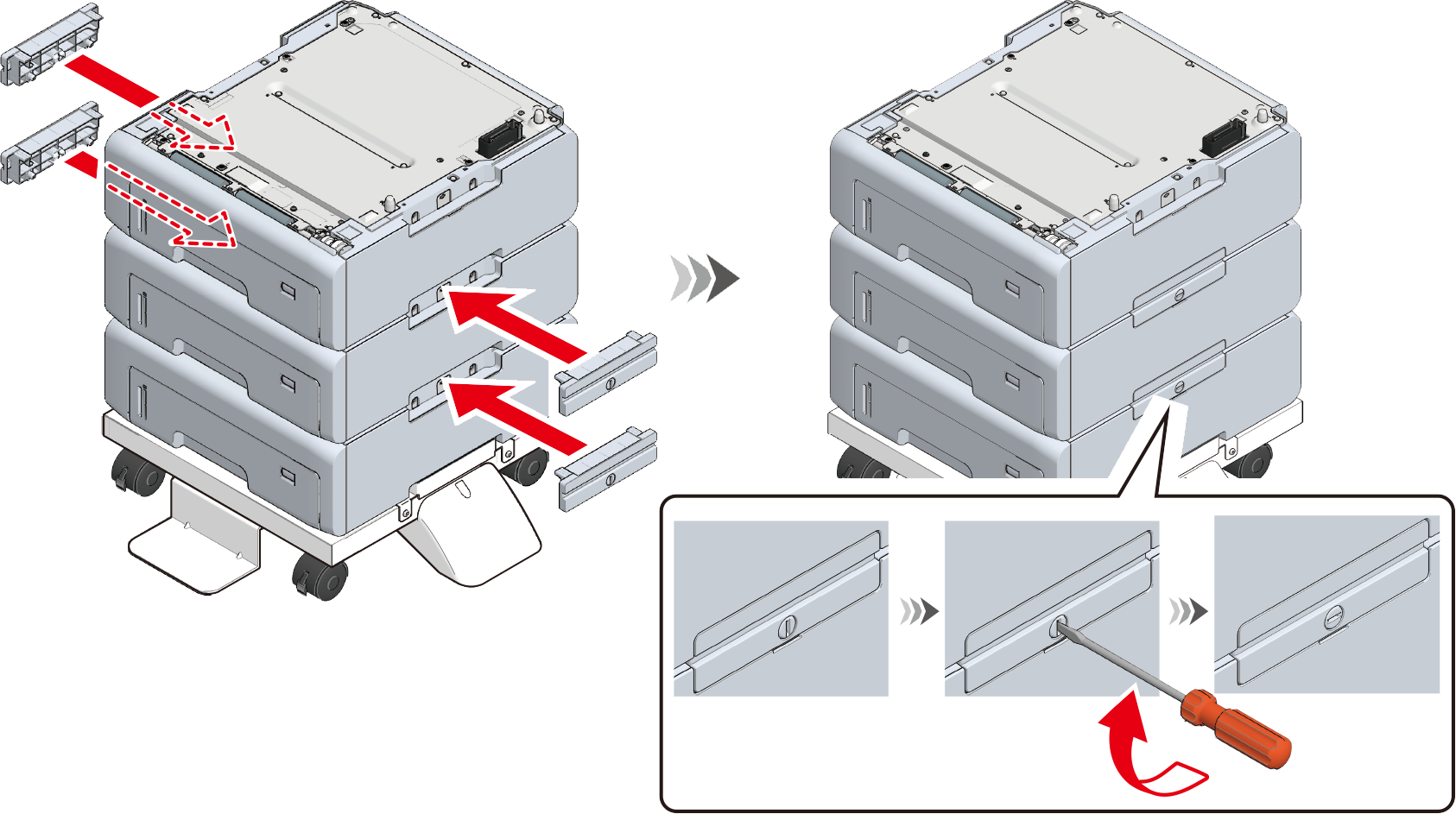 Når den ekstra bakkeenhed er installeret, skal du fastgøre hovedenheden og den ekstra bakkeenhed på begge sider med tilbehør ved hjælp af en fladhovedet skruetrækker.