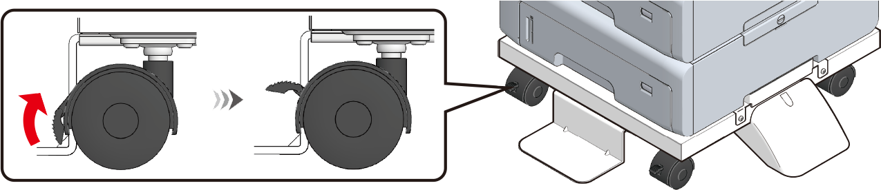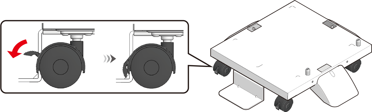 Før du flytter denne maskine, skal du låse hjulene (x 2) op.