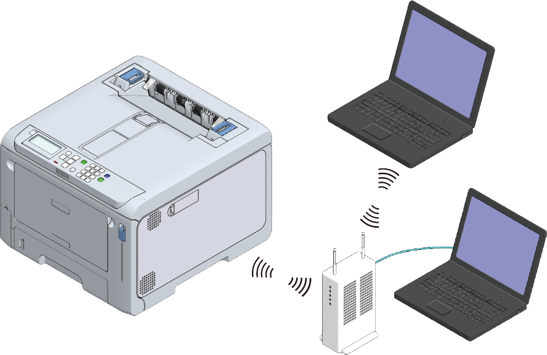 | Beskrivelse | Tilslut denne maskine og den trådløse terminal (pc, tablet, smartphone osv.) via et adgangspunkt. | Indstil denne maskine som et trådløst adgangspunkt, og tilslut den direkte til den trådløse terminal (pc, tablet, smartphone osv.). |