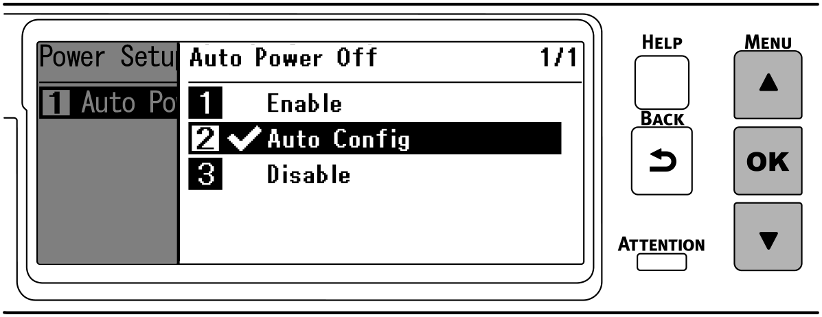 Pro automatické vypnutí jsou dostupné 3 typy nastavení, a vypnutí tovární nastavení je [Auto Config (Auto konfig)].