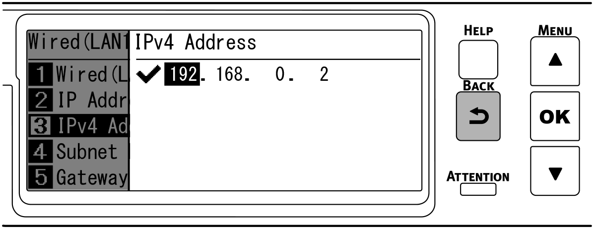 Naciśnij «BACK (WSTECZ)», a następnie naciśnij ▼ aby wybrać [IPv4 Address (Adres IPv4)] na ekranie [Wired(LAN1) Setup (Konfiguracja przewodowa (LAN1))] i naciśnij «OK».