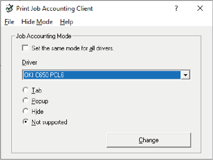 By ustawić ten sam tryb na wszystkich sterownikach drukarki, zaznacz pole [Set the same mode for all drivers (Ustaw ten sam tryb we wszystkich sterownikach)]. - Wybierz [Tab (Zakładka)] i kliknij [Change (Zmień)].