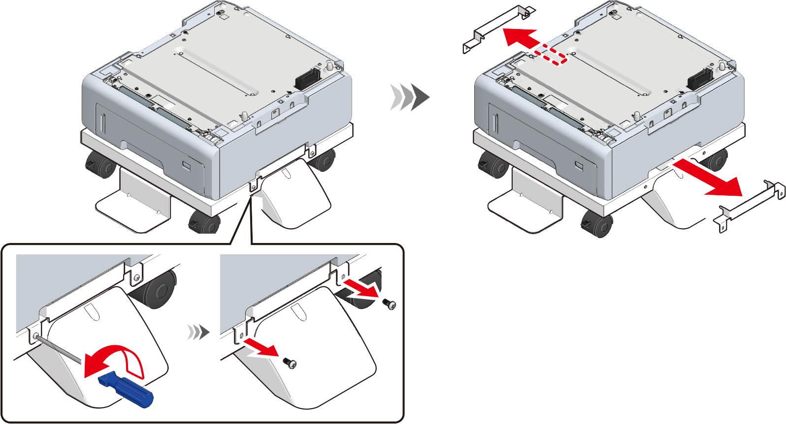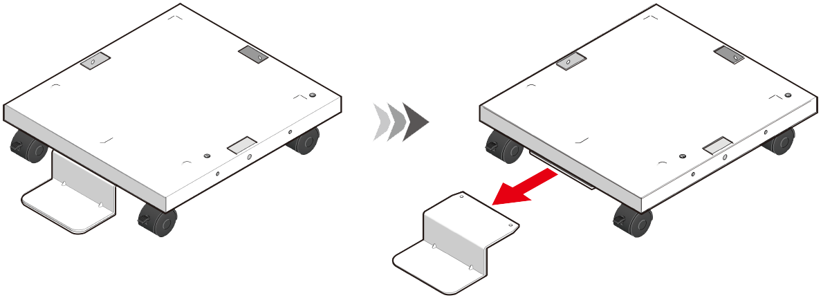 Εάν έχει εγκατασταθεί η βάση με τροχούς, χρησιμοποιήστε ένα σταυροκατσάβιδο κεφαλής Phillips για να αφαιρέσετε τα μεταλλικά εξαρτήματα τοποθέτησης (x 2) που στερεώνουν τη βάση με τροχούς και τη μονάδα δίσκου επέκτασης.