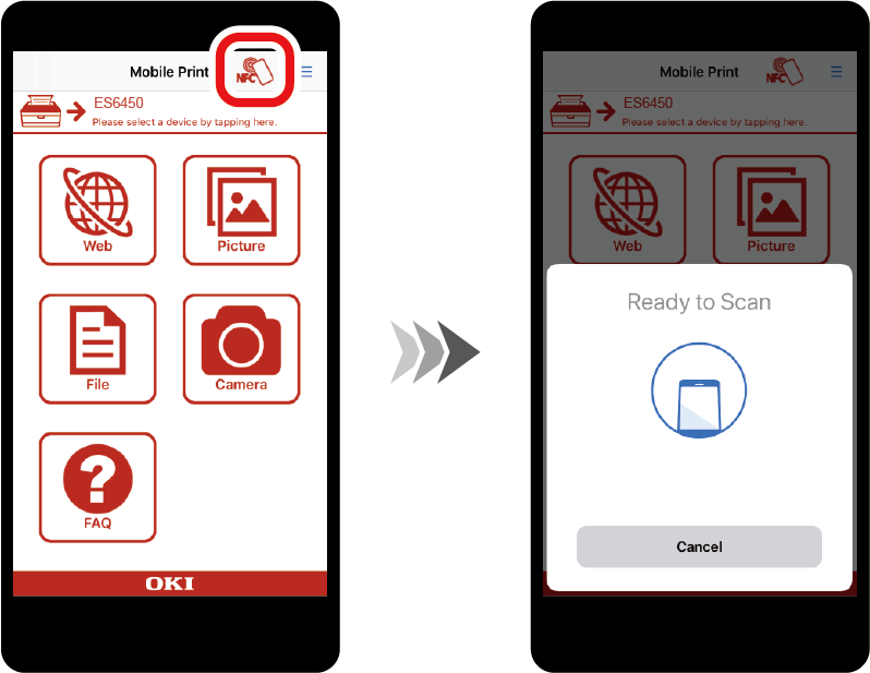 - 如果您使用的是 iOS 系统,请点击 [NFC] 显示 [Ready to Scan (扫描准备就绪)],然后将移动设备靠近本设备。