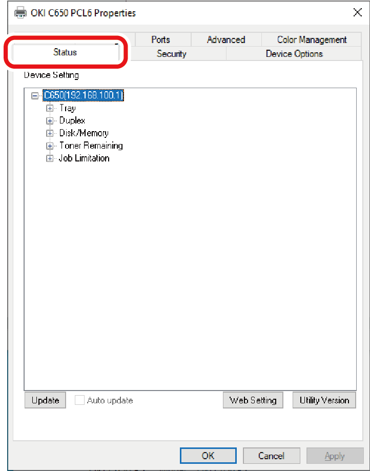 您可以在 [Printer Properties(打印机属性)] 屏幕上查看本设备的设置。